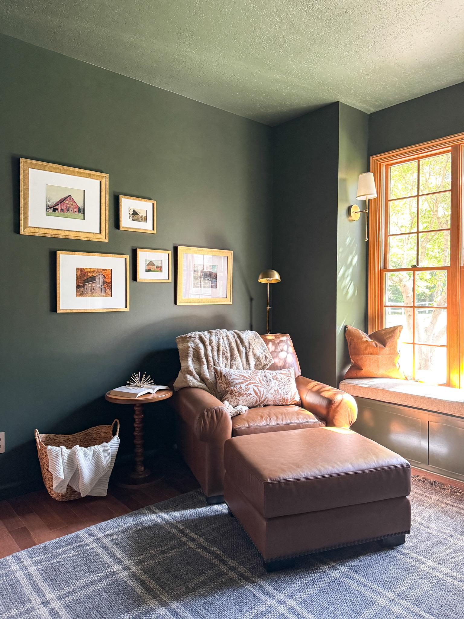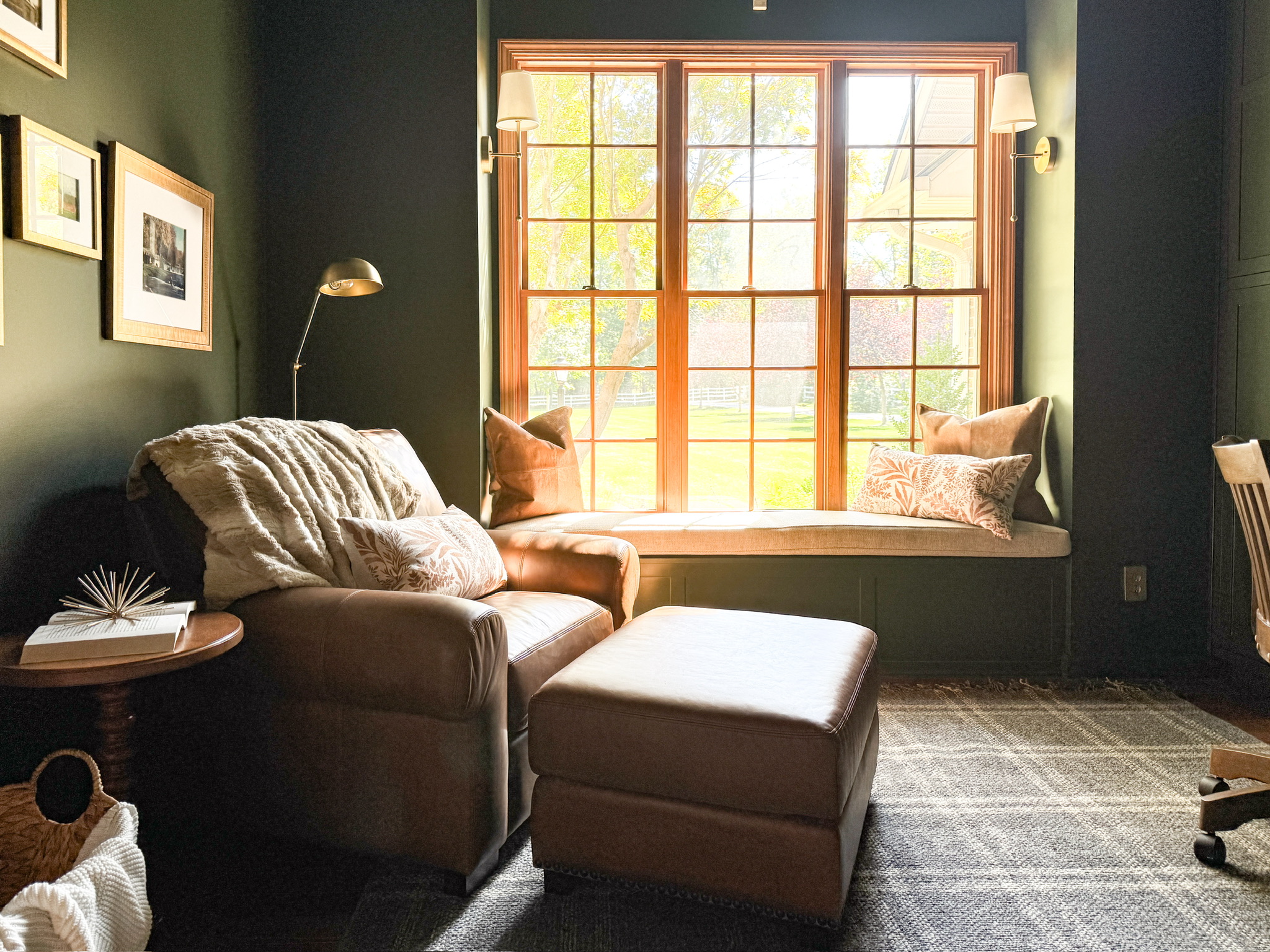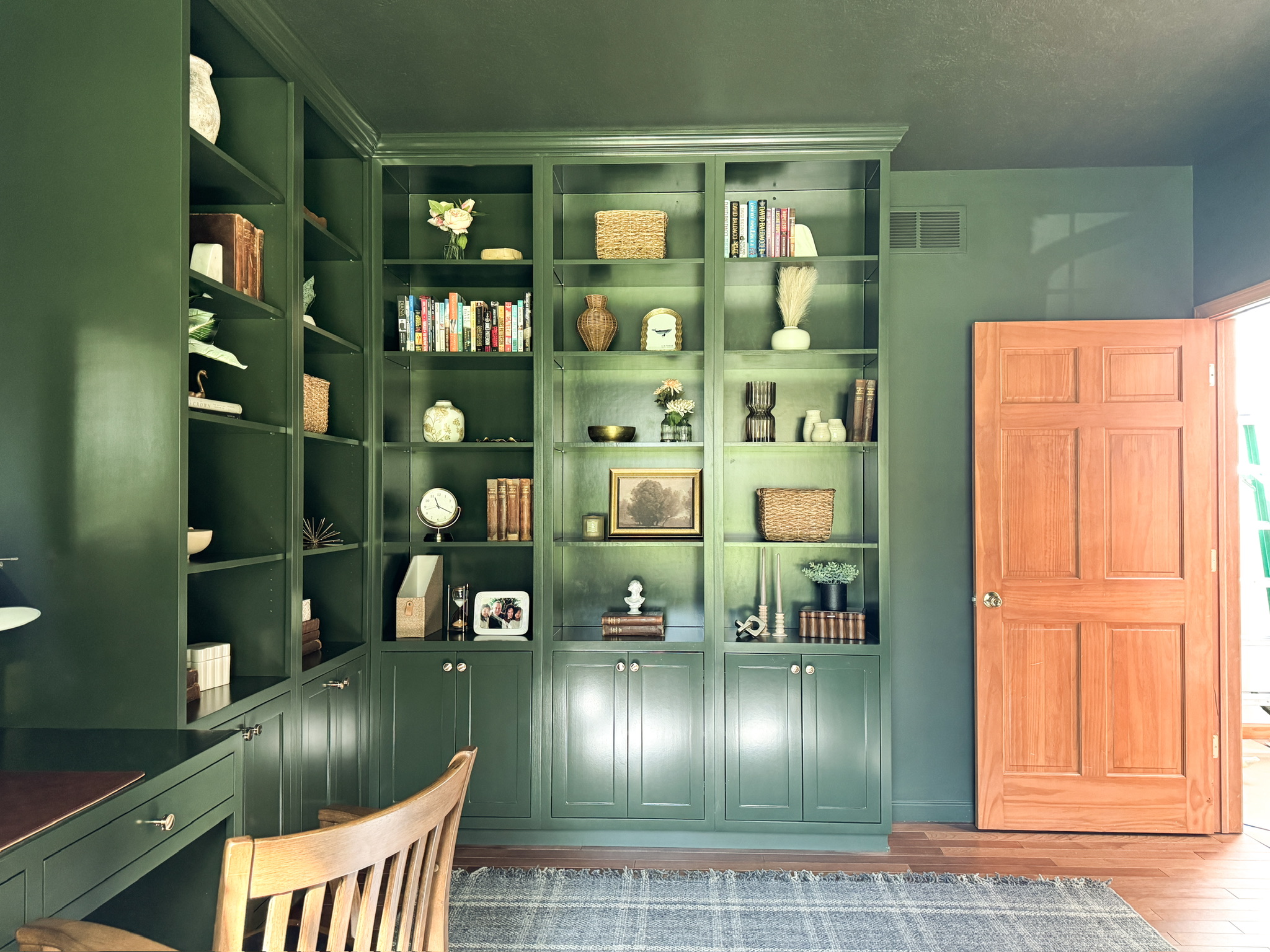 This traditional brick manor’s office reflects the home’s classic character, with wood trim and timeless architectural details setting the tone. Custom built-ins are seamlessly integrated, designed to feel as though they have always been part of the space. New hardwood floors add warmth and continuity, while a deep, color-drenched green envelops the room, bringing depth and richness. The result is a traditional, cozy, lived-in, comfortable, and highly functional workspace that feels cohesive with the home’s overall style.